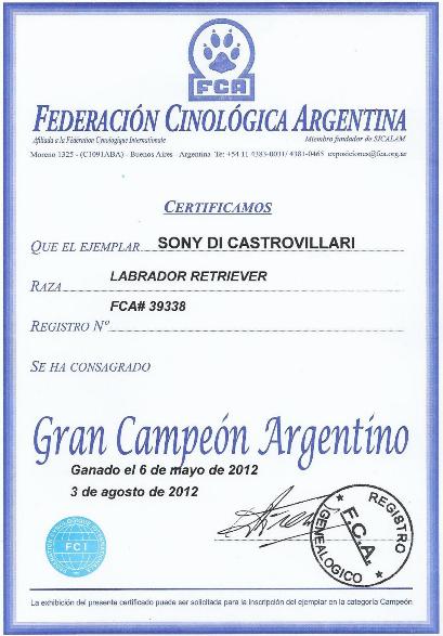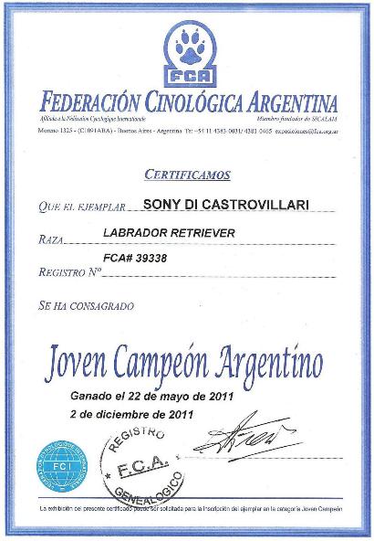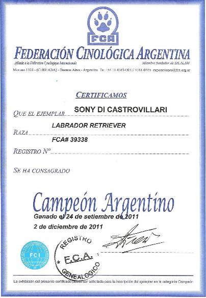 SONY DICASTROVILLARI: JOVEN CAMPEON ARGENTINO, CONSAGRANDOSE CAMPEON ARGENTINO, GANANDO 3 CAC MAYORES CONSECUTIVOS CON LOS SIGUIENTES JUECES: