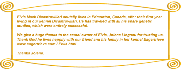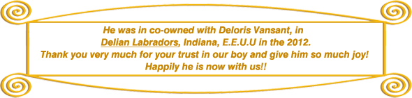 Special thanks to Mrs. Jolene Lingnau, owner the male "Champion Eagertrieves Downtown Brown" - Dylan -, the breeding Eagertrieve Labradors www.eagertrieve.com from Canadá., for placing her trust in the kennel Di Castrovillari. We also thank and recognition of the professional who was responsible for the task of breeding with outstanding success, Dr. Javier Fariña.
